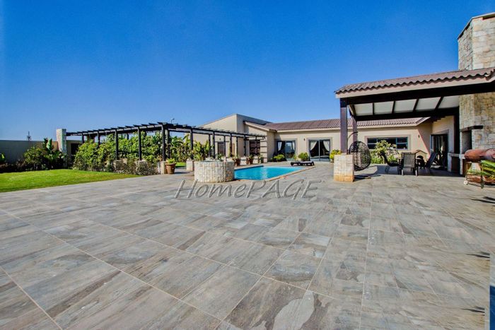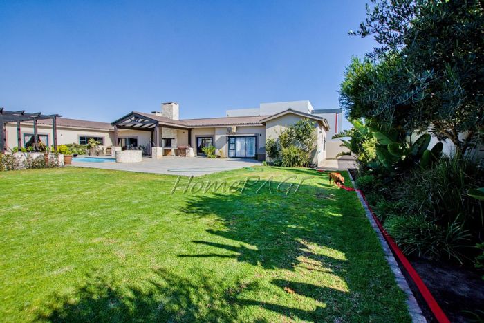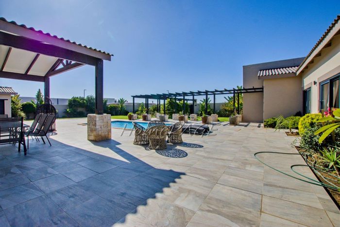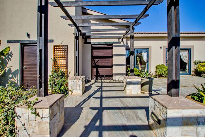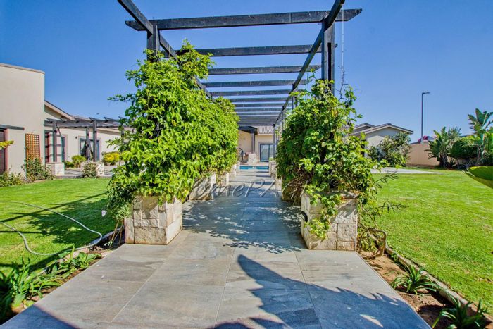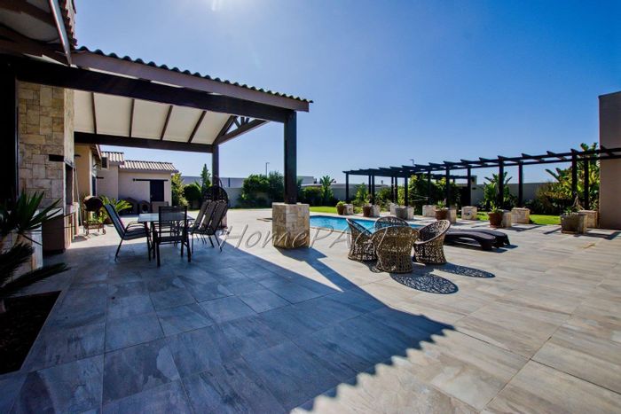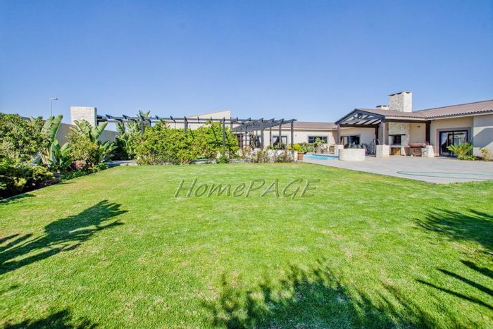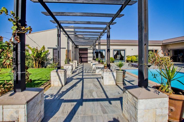 Entertainer's retreat in Walvis Bay with sheltered L-shaped garden and large pool, covered BBQ room/bar opening to patio — three bedrooms, two bathrooms and three garages.