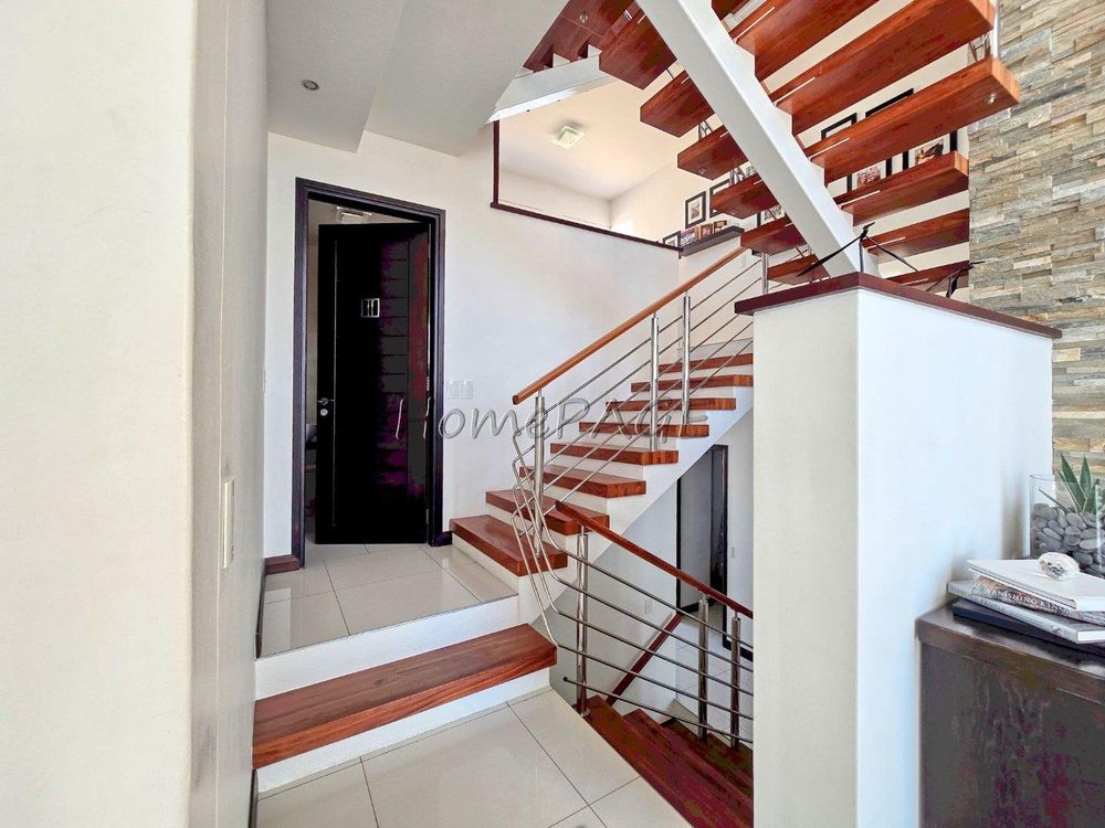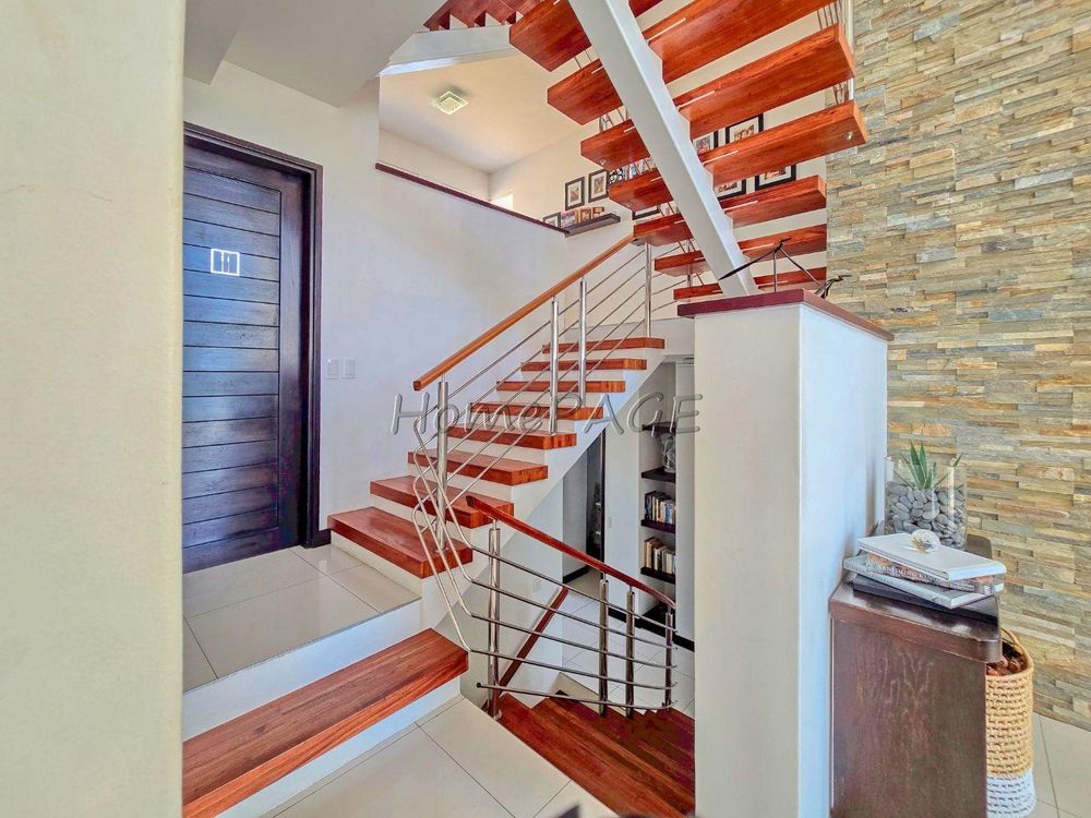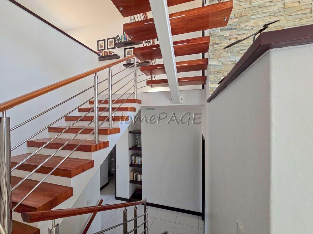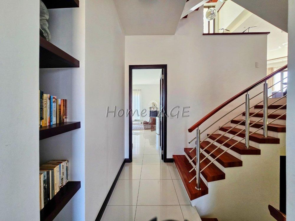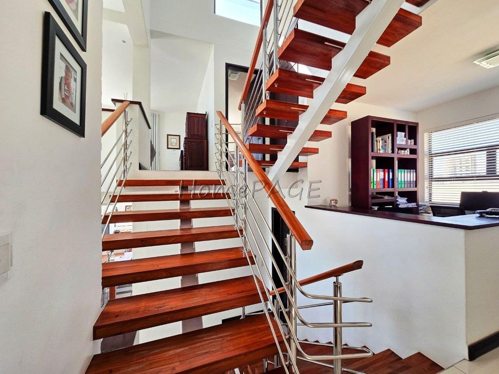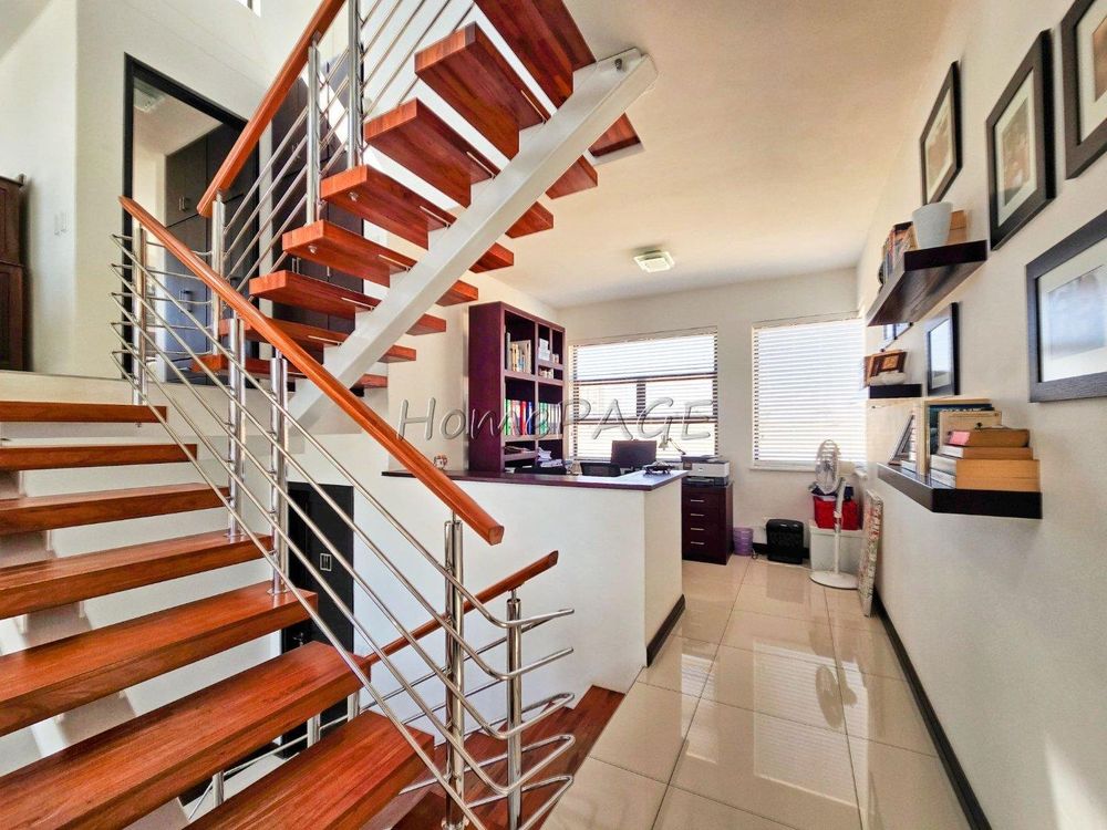 The home is on an elevated plot, thus was home designed on multiple levels. Our images are in sequence from the living area, upstairs to the 3 bedrooms, and again from the living area to the guest suite, laundry room and garage