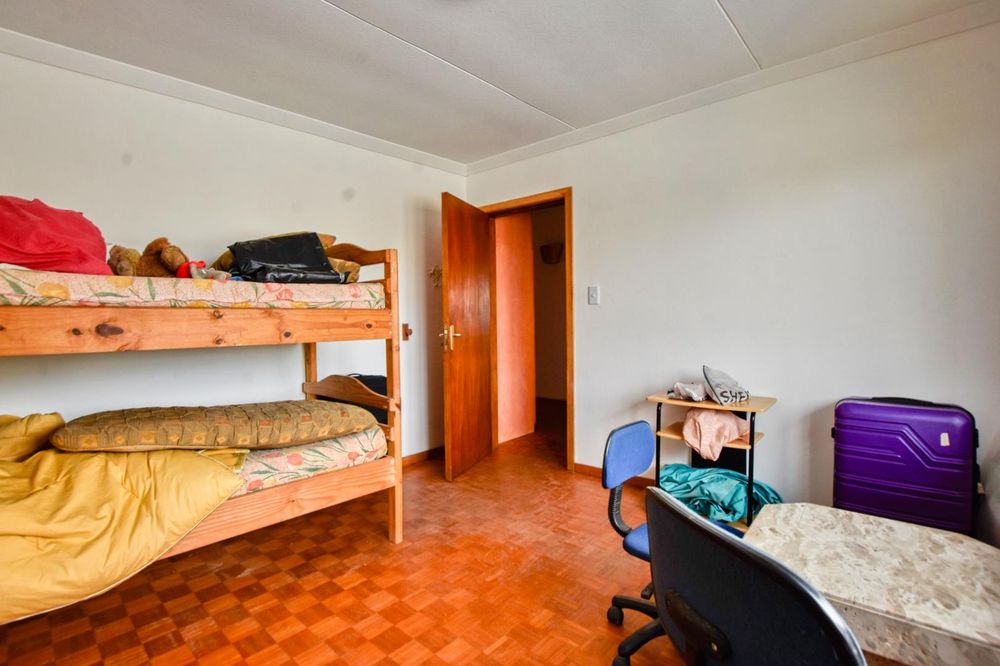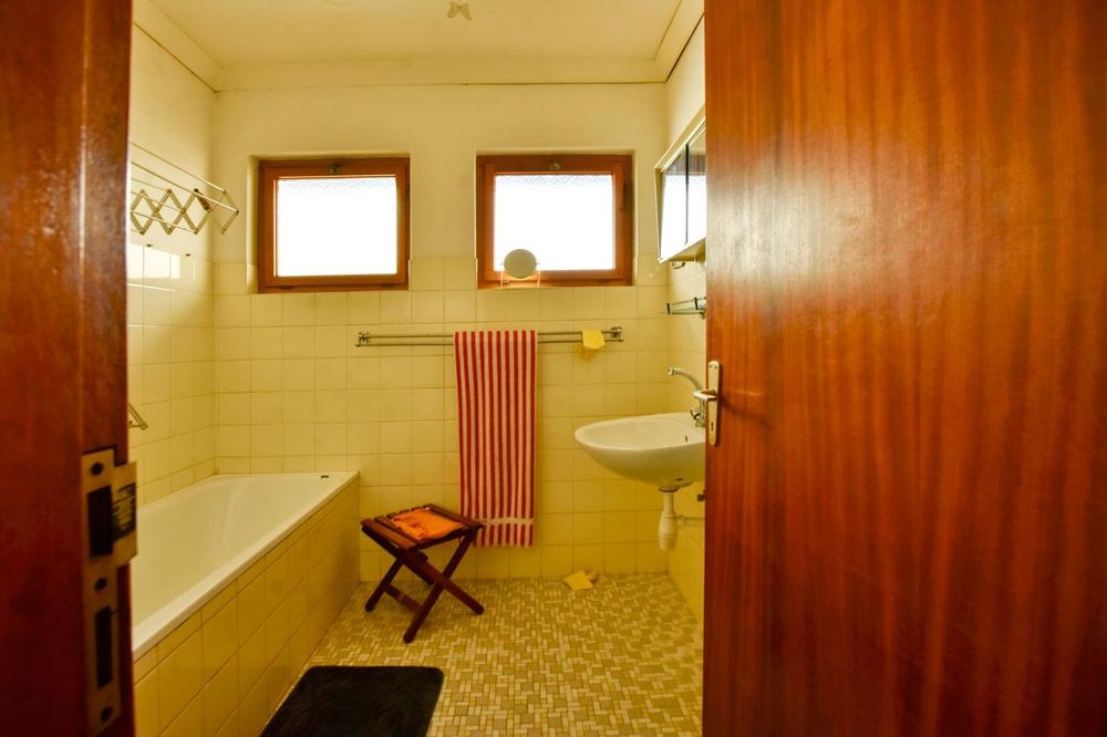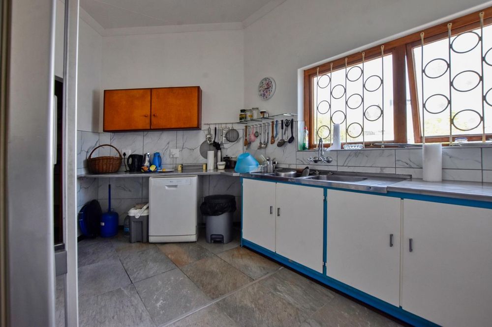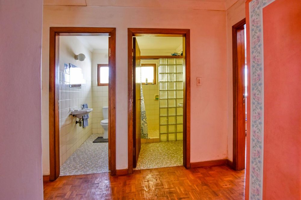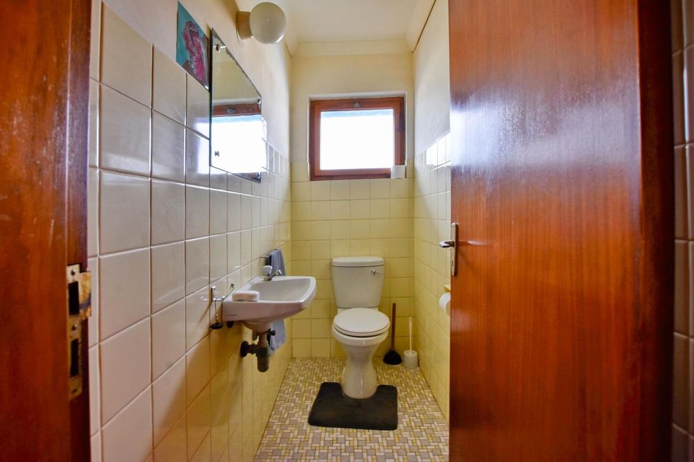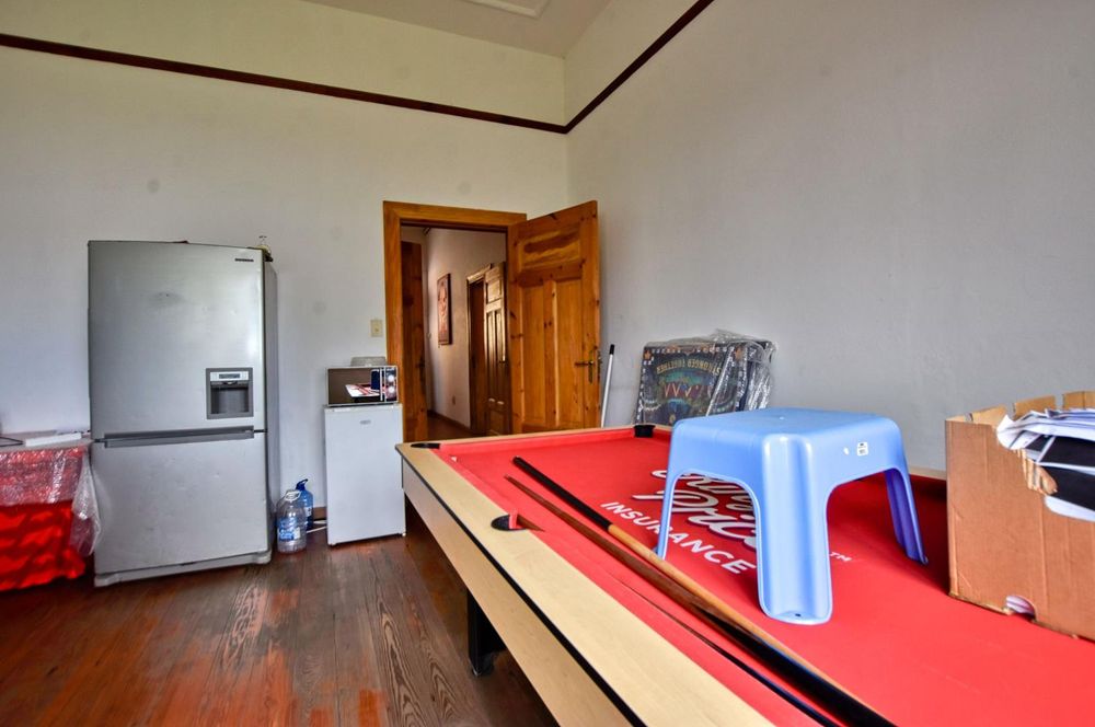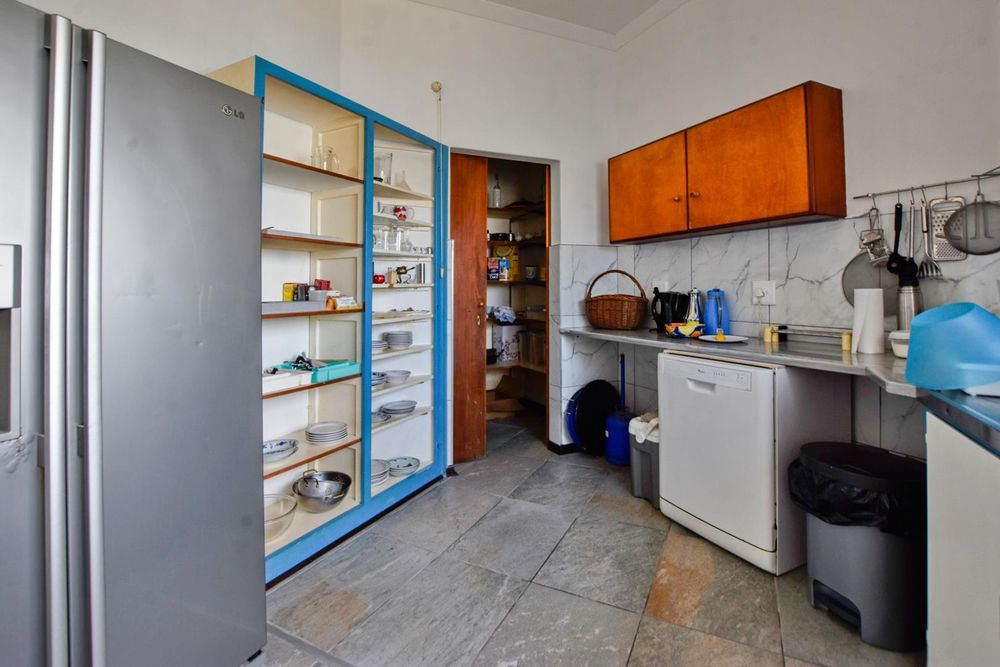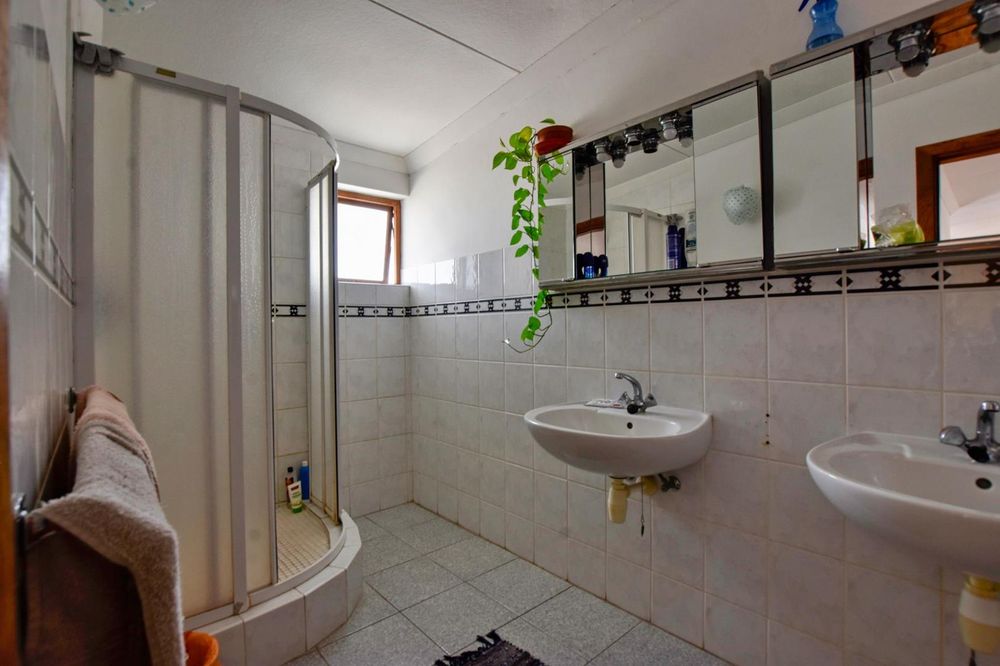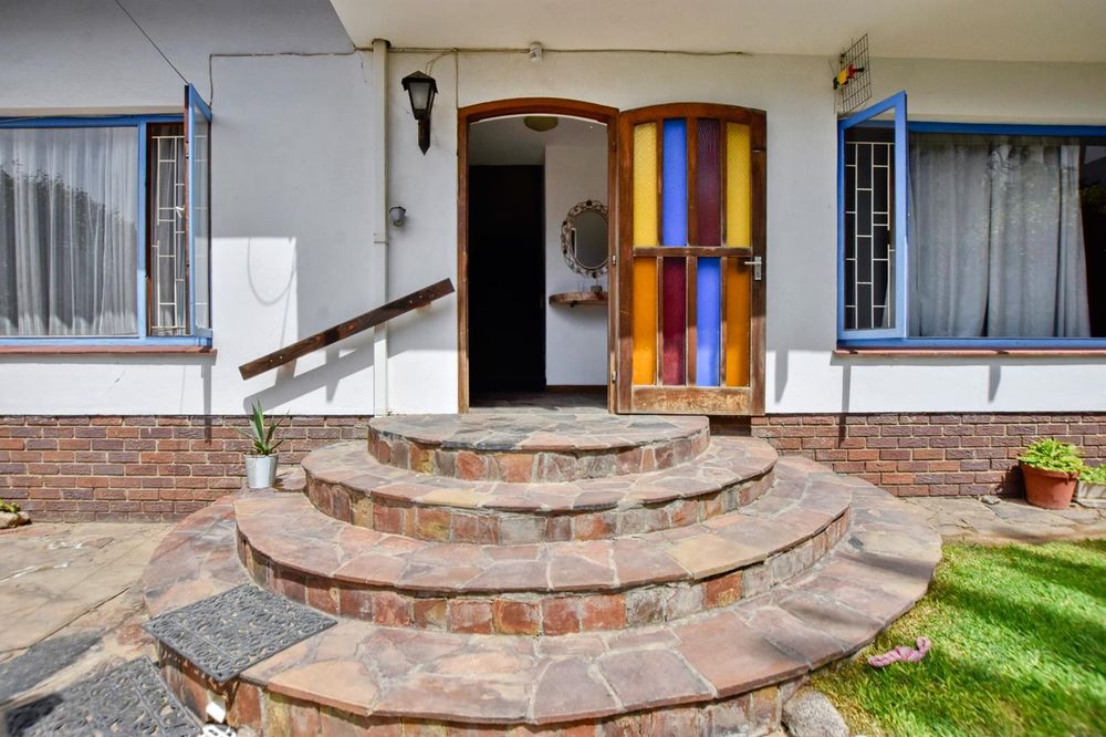 The ground floor comprises of: Entrance, lounge with fireplace, covered stoep, kitchen with built-in cupboards and fitted appliances, pantry, laundry, passage with linen cupboards, three bedrooms without any built-in cupboards, bathroom with bath and hand washbasin, separate shower, and hand washbasin, as well as separate WC and hand washbasin. Furthermore, there is bachelor type cottage comprising: living area and bedroom, kitchenette, bathroom with bath, WC, and hand washbasin.