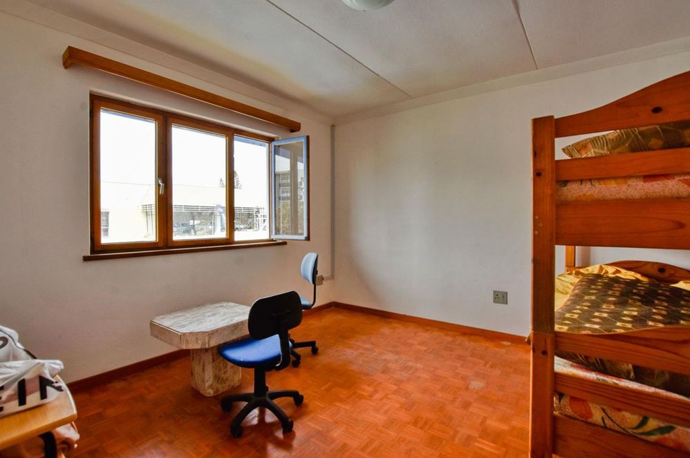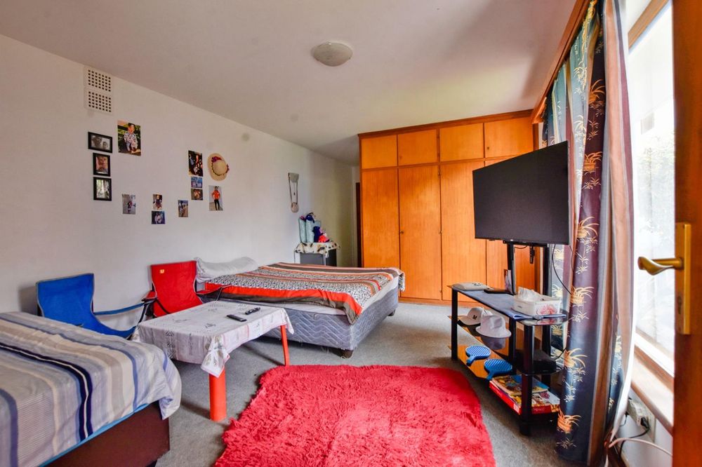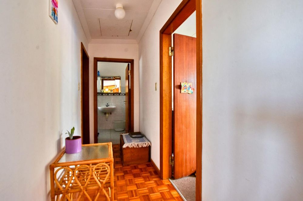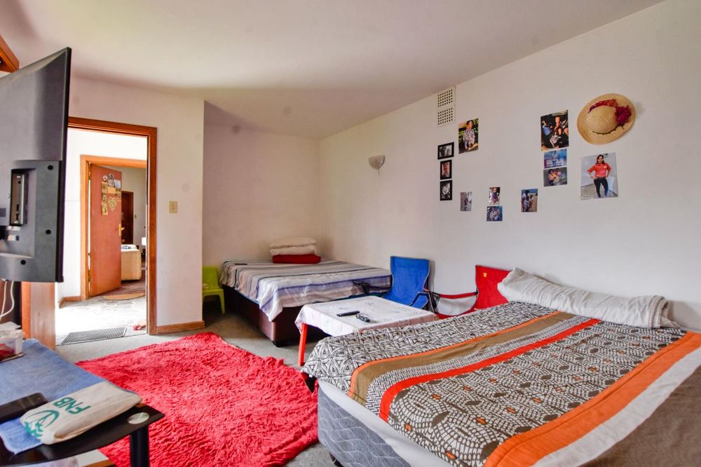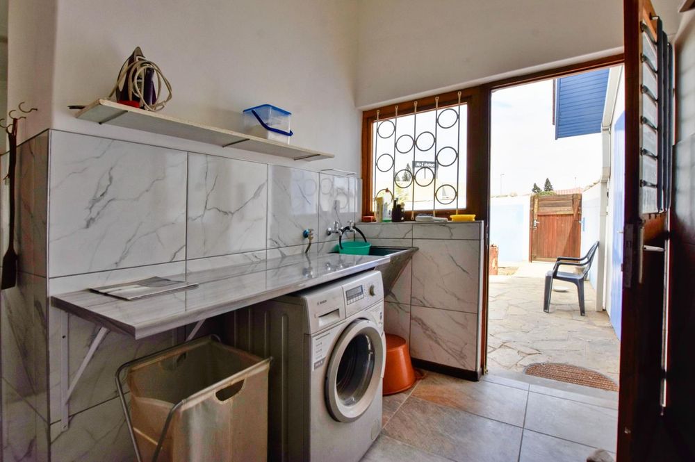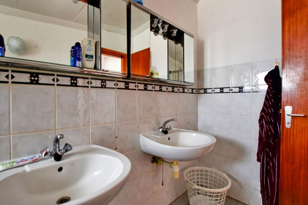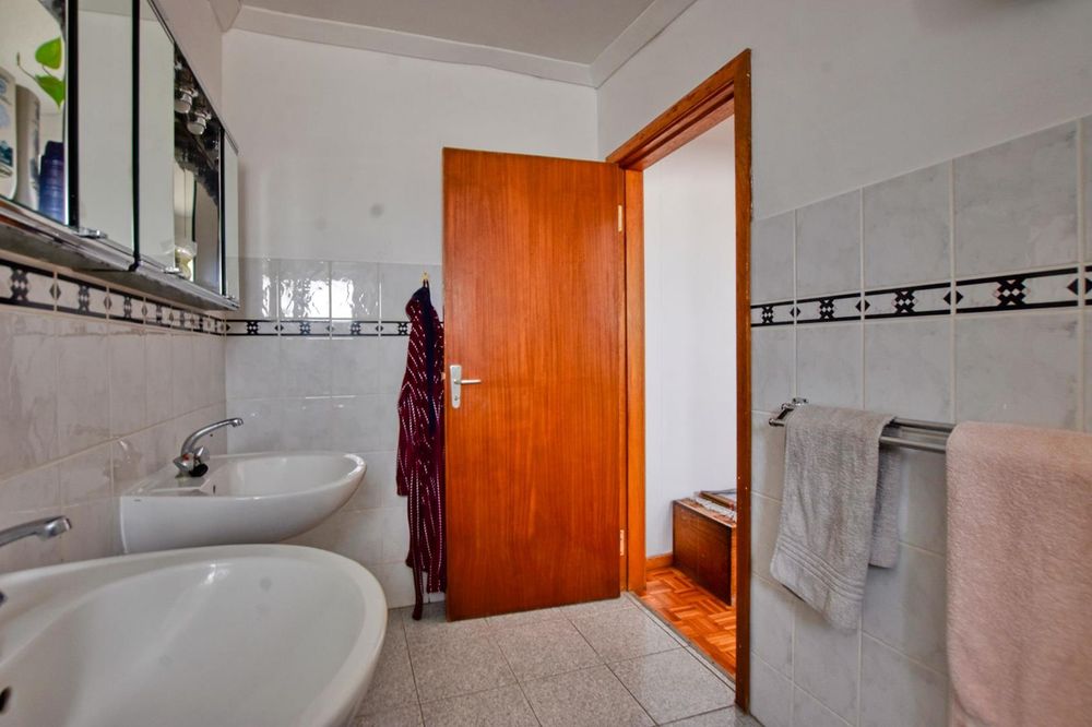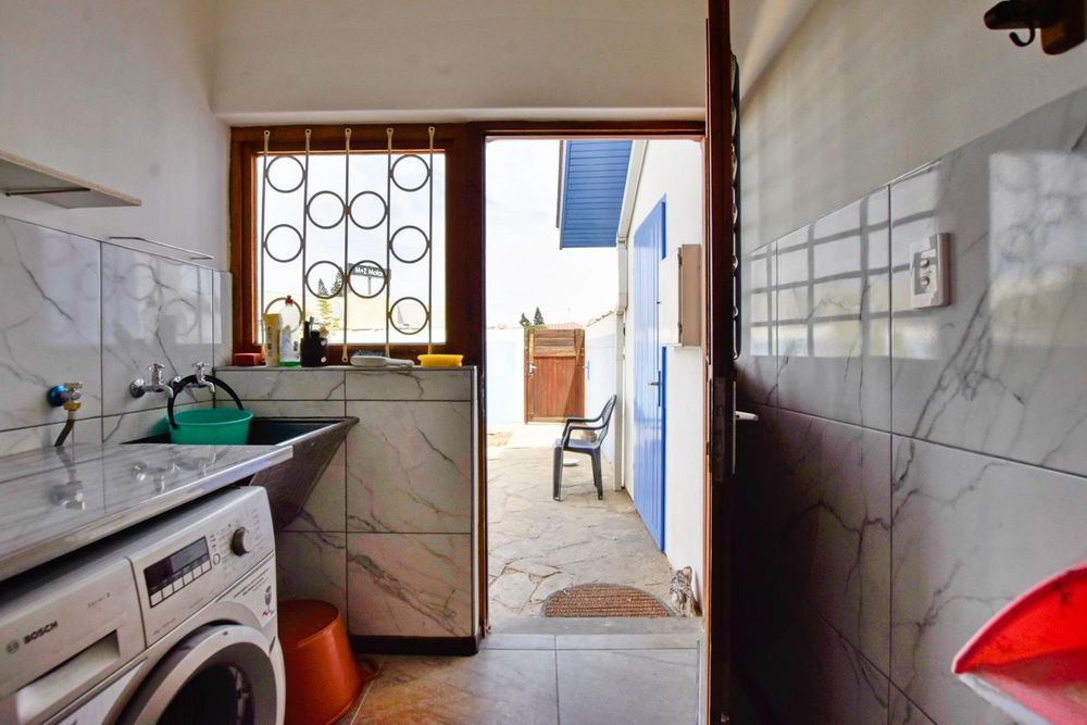 The ground floor comprises of: Entrance, lounge with fireplace, covered stoep, kitchen with built-in cupboards and fitted appliances, pantry, laundry, passage with linen cupboards, three bedrooms without any built-in cupboards, bathroom with bath and hand washbasin, separate shower, and hand washbasin, as well as separate WC and hand washbasin. Furthermore, there is bachelor type cottage comprising: living area and bedroom, kitchenette, bathroom with bath, WC, and hand washbasin.