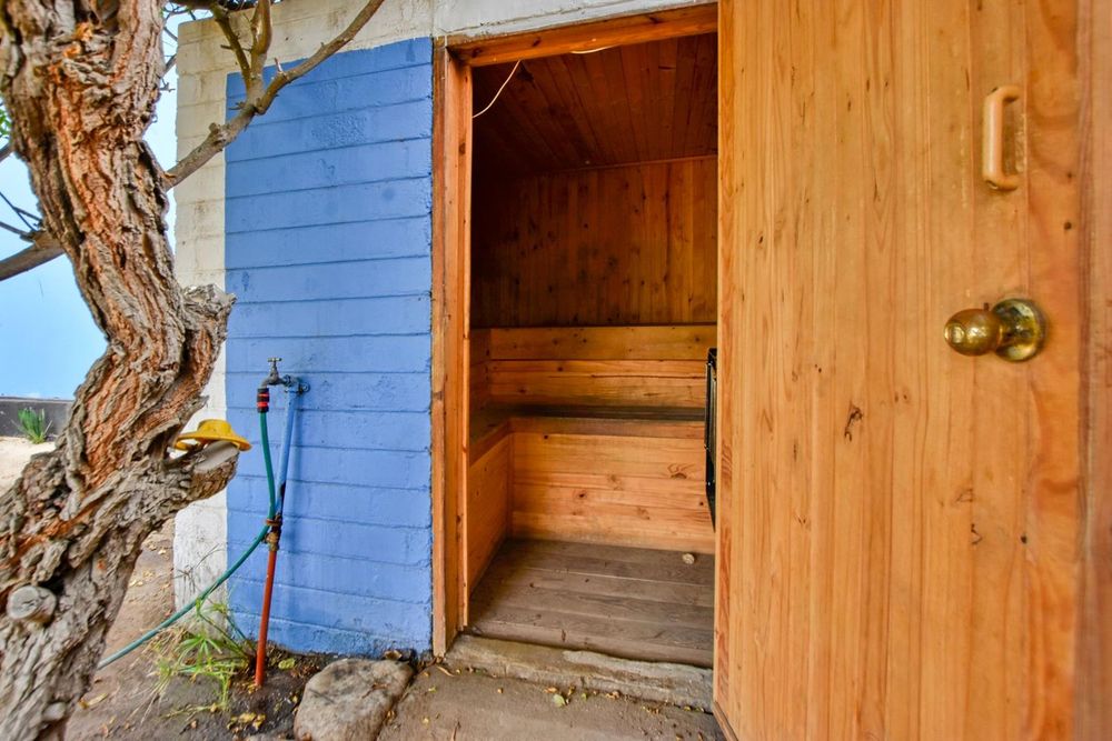 Boundary, fire- and yard walls, gates, driveway, paving, security systems, storage cubicles to front of building, exterior staircase, sauna